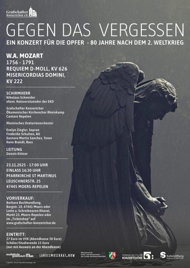 23.11.2025 17:00 ein Konzert für die Opfer – 80 Jahre nach dem 2. Weltkrieg W.A. Mozart 1756 – 1791 Requiem d-Moll, KV 626 Misericordias Domini, KV 222   Schirmherr Nikolaus Schneider ehem. Ratsvorsitzender der EKD Grafschafter Konzertchor Ökumenischer Kirchenchor Rheinkamp Cantare Repelen Rheinisches Oratorienorchester Evelyn Ziegler, Sopran Frederike Schulten, Alt Gustavo Martin Sanchez, Tenor Keno…