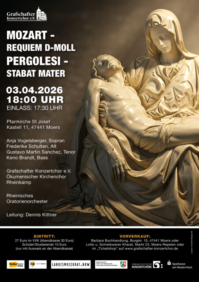 03.04.2026 18:00 Mozart – Requiem d-Moll Pergolesi – Stabat Mater Grafschafter Konzertchor Ökumenischer Kirchenchor Rheinkamp Rheinisches Oratorienorchester Anja Vogelsberger, Sopran Frederike Schulten, Alt Gustavo Martin Sanchez, Tenor Keno Brandt, Bass Leitung Dennis Kittner   Karten sind ab sofort an folgenden Stellen erhältlich: Barbara-Buchhandlung, Burgstr. 3, 47441 Moers Lotto u. Schreibwaren Kharat, Markt 23, Moers-Repelen  …
